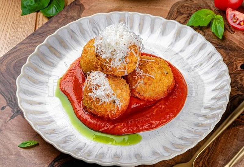 Rice, shrimp, Parmesan cheese, egg, breadcrumbs, tomato sauce. Contains allergens: shellfish, egg, gluten, milk and dairy products.