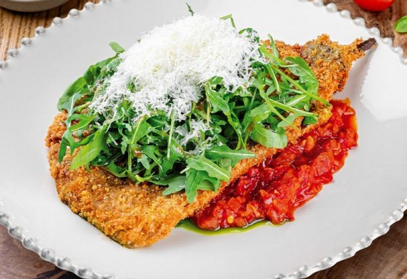 Eggplant, egg, flour, panko breadcrumbs, givech, arugula, picorino cheese, olive oil. Contains allergens: egg, milk, gluten.