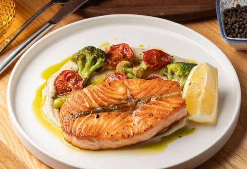 Salmon, parsnips, potatoes, cream, butter, cherry tomatoes, broccoli, lemon. Contains allergens: fish, milk.