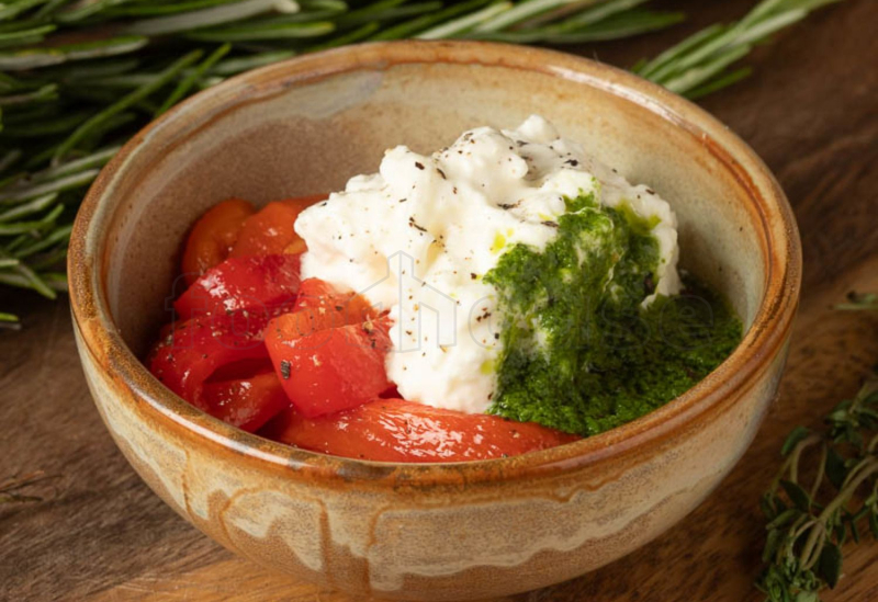 Stracciatella cheese, cappi peppers, pesto sauce, salt, oregano, and black pepper. Contains allergens: dairy products, nuts.