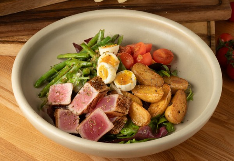 Fresh tuna, mixed salad, potatoes, green beans, cherry tomatoes, quail egg, sauce. Contains allergens: fish, egg.