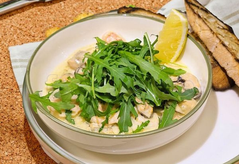 shrimp, mussels, white wine, cream, coconut milk, butter, garlic, mixed salad, aromatic oil, lemon, ciabatta bread