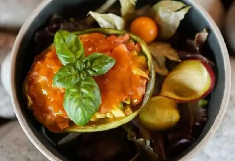 Avocado, fructe, ardei copți, roșii, busuioc, sos