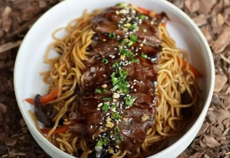 Tăiței de grâu, ardei gras, shiitake, mușchiuleț de vită, ceapă verde, semințe de susan
