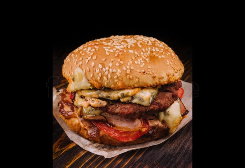 carne de vită, roșii, salată de aisberg, șuncă, brânză Dor albastru, marmeladă de ceapă, sos picant