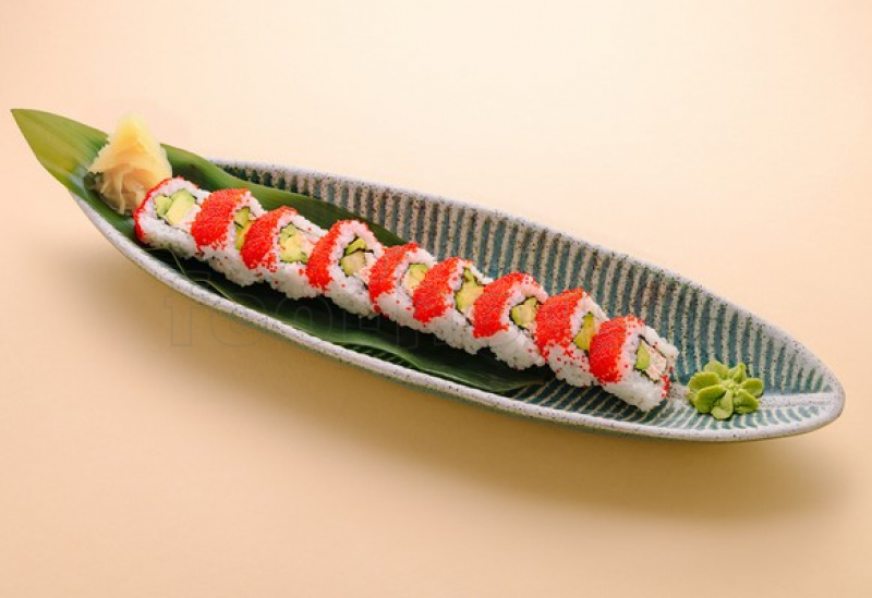 Orez, nori, avocado, brânză, carne de crab, tobiko roșu.