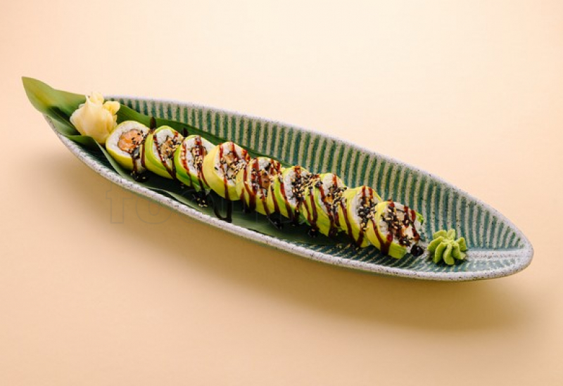 Orez, nori, țipar, somon, cremă de brânză, avocado, sos unagi, susan.