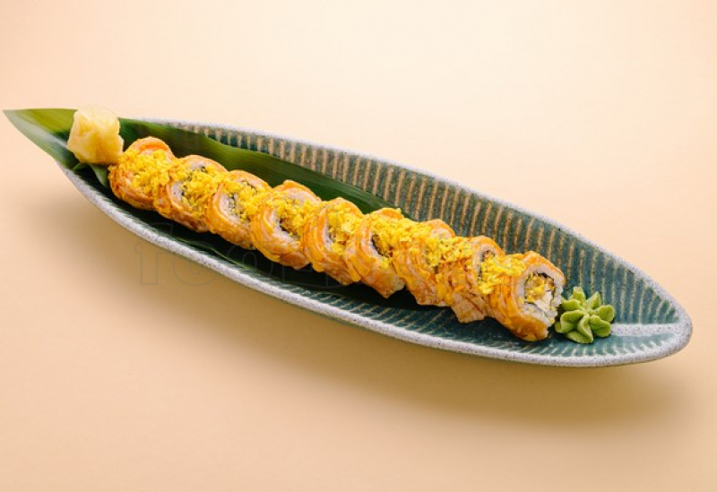 Orez, nori, creveți, cremă de brânză, somon prăjit, maioneză picantă, nachos. 9 bucăți