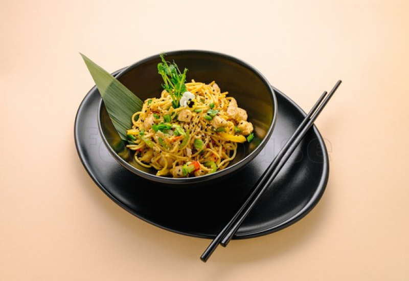 Tăiței de ou prăjiți în wok, amestecați cu piept de pui fraged, legume crocante de sezon și semințe de susan.
