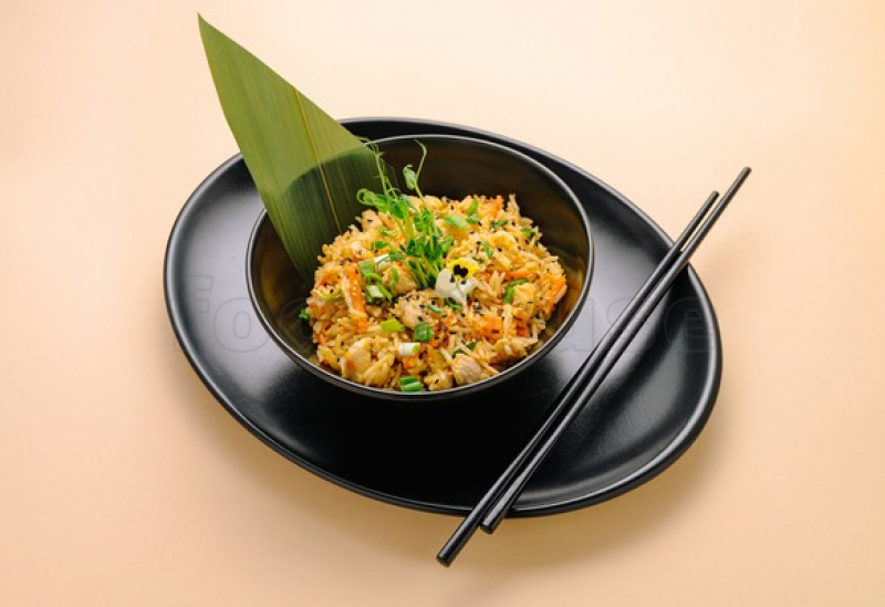 Orez prăjit auriu cu piept de pui suculent, condimente, ceapă verde și semințe de susan.