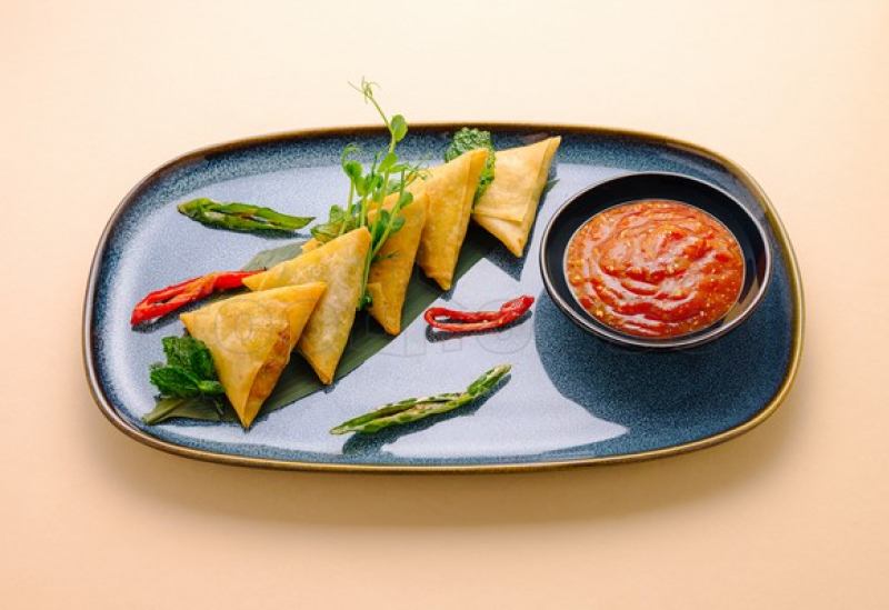 Aluat crocant, prăjit în ulei, umplut cu un amestec aromat de legume. Servit cu un sos dulce-chili special.