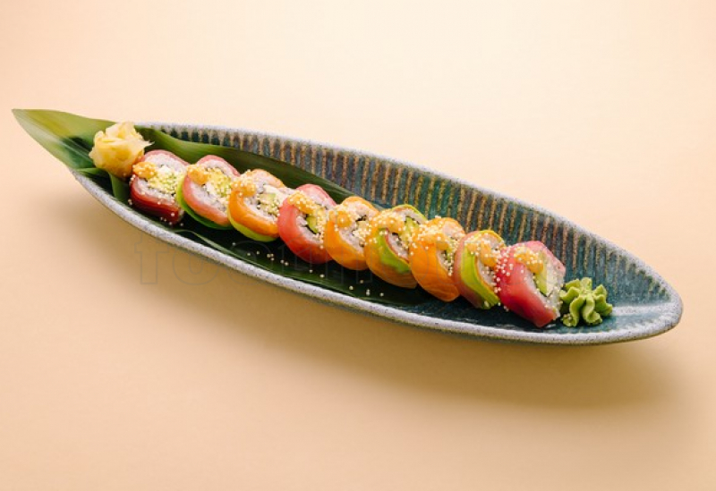 Orez, nori, avocado, cremă de brânză, somon, ton.