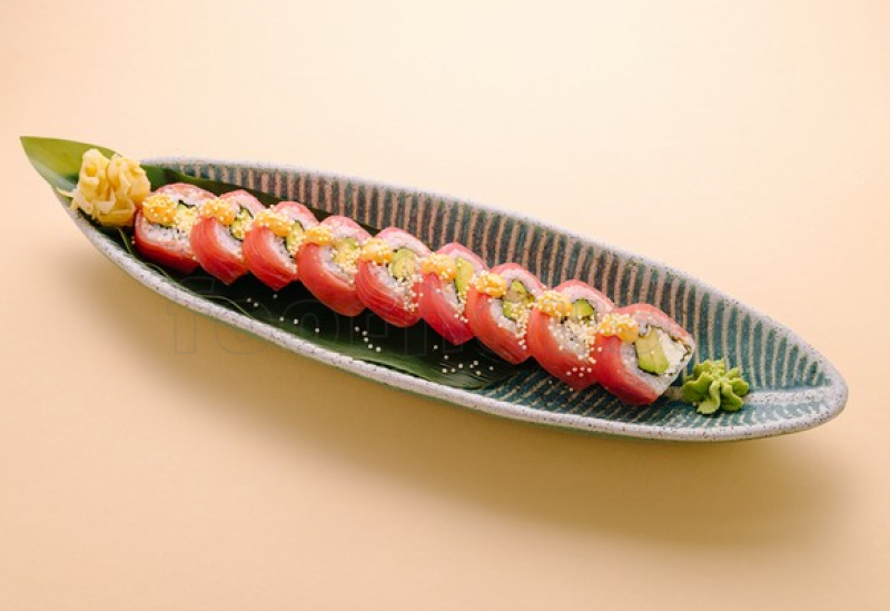 Orez, nori, avocado, cremă de brânză, ton, maioneză picantă.