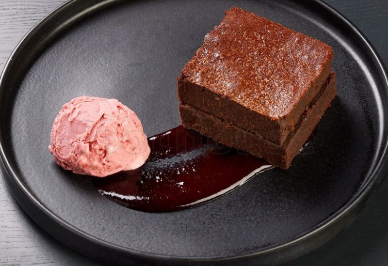 шоколадный брауни, шоколадное мороженое, джем из лесных ягод.