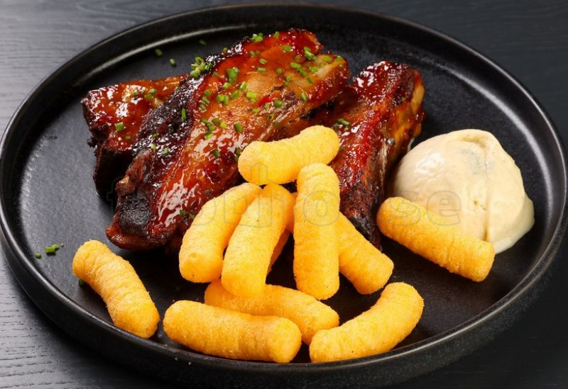 копченые свиные ребра, горчица, кунжутное масло, соевый соус, остро-сладкий соус, кукурузные палочки, мороженое из горгонзолы.