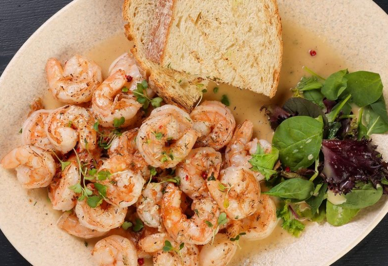 креветки, домашний хлеб на закваске, сливочное масло, зелень, чеснок, белое вено, перец чили.