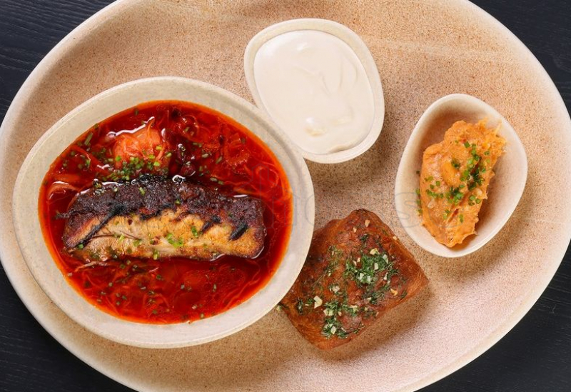 бульон, картофель, капуста, лук, морковь, свекла, стебель сельдерея, чеснок, красная фасоль, свиное ребро, сметана, пряное сало, зелень, домашняя пампушка.