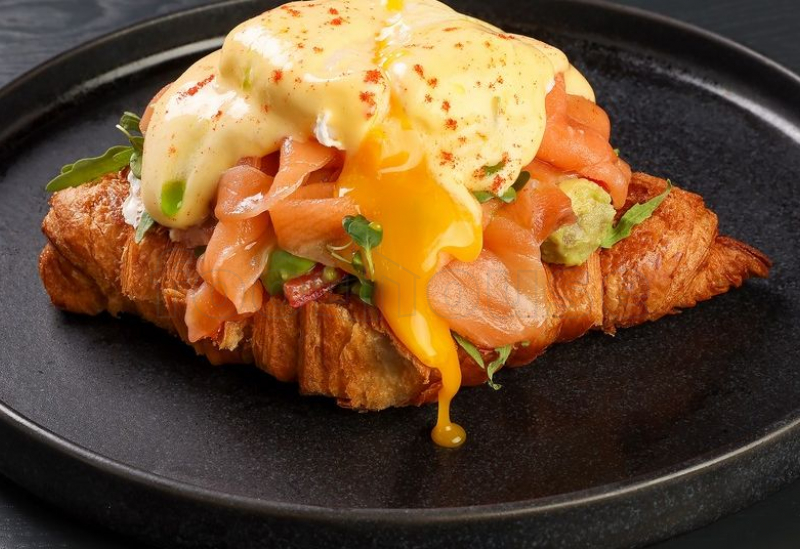 круассан, сливочный крем, микс салата, гуакамоле, семга слабосоленая, яйцо пашот, голландский соус