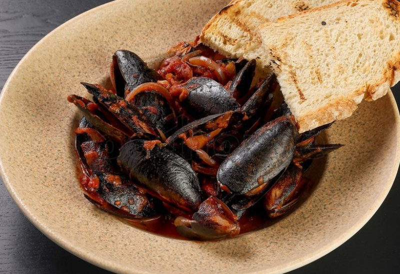 мидии, домашний хлеб на закваске, лук, чеснок, зелень, красное вино, томатный соус, сливочное масло.