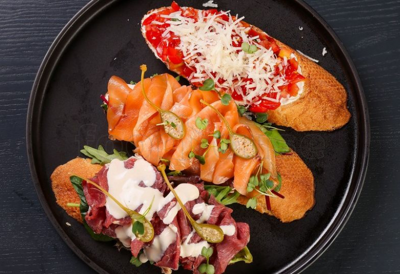 Домашний багет, сливочный сыр, томаты черри, соус сладкий чили, зелень, семга слабой соли, соус тонатто, говяжий антрекот, микс салата.
