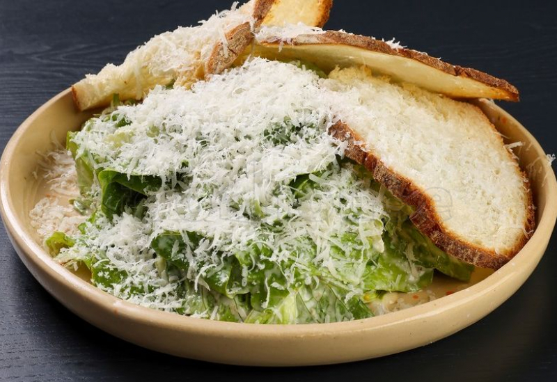 куриный шницель, салат романо, соус цезарь, пармезан, домашние гренки