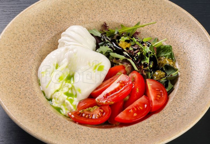 буррата, томаты черри, микс салата, домашняя заправка, cоус песто, бальзамический крем.