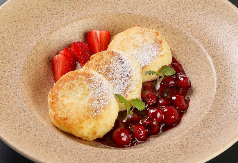 сладкие творожные сырники, греческий йогурт, джем из вишни, ягоды, сахарная пудра