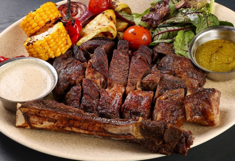томагавк, микс салата, домашняя заправка, кабачок, сладкий перец, красный лук, томаты черри, кукуруза, перечный соус.