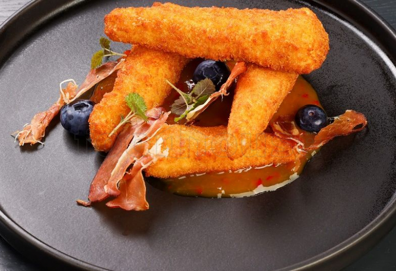 Жареный бри с соусом маракуйя и чипсом из прошутто
