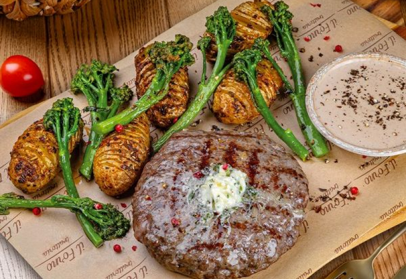 Говядина рубленая, сыр моцарелла, соль, чёрный перец, брокколини, картофель со специями, перечный соус. Аллергены: молочные продукты.