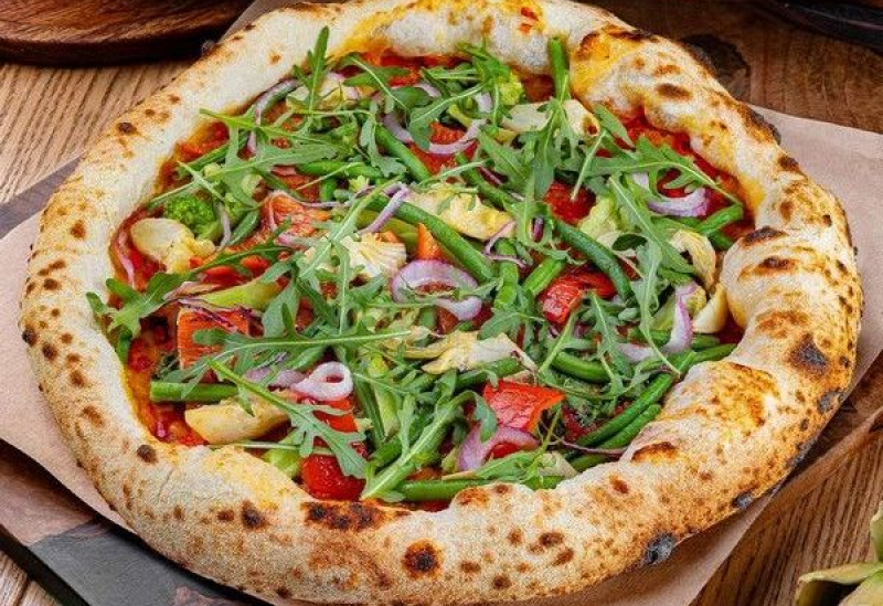 Тесто для пиццы, гивеч, брокколи, стручковая фасоль, перец каппи, артишоки, маринованный красный лук, руккола, базилик, оливковое масло. Аллергены: глютен.