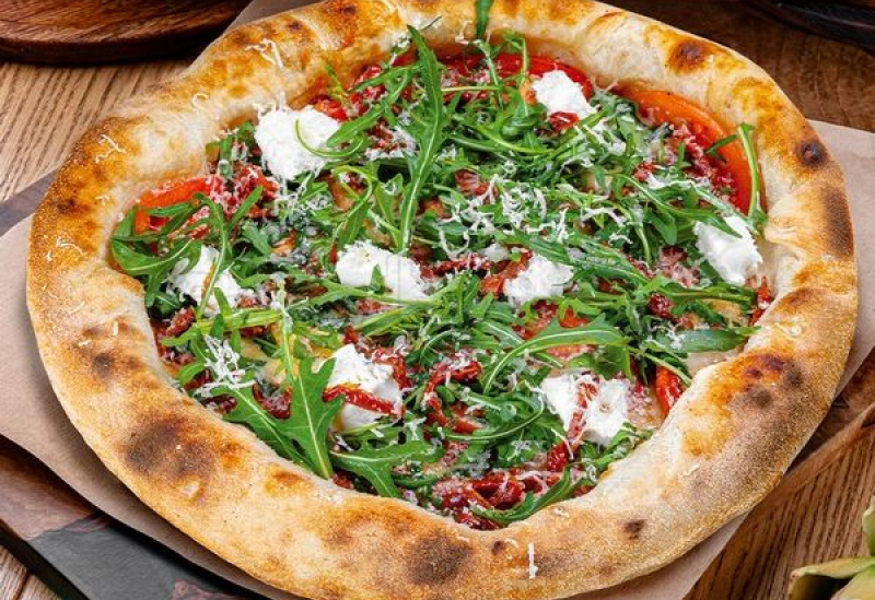 Тесто для пиццы, мука, томатный соус, свежие помидоры, сыр моцарелла (зот), козий сыр, руккола, вяленые помидоры, сыр пекорино, оливковое масло. Аллергены: глютен, молочные продукты.