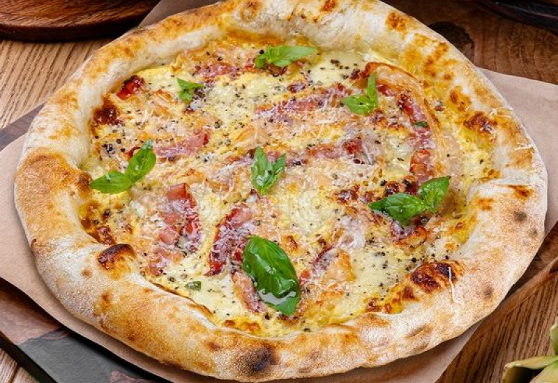 Тесто для пиццы, мука, соус карбонара, бекон панчетта, сыр пекорино, сыр моцарелла (зот), базилик, чёрный перец. Аллергены: глютен, молочные продукты.