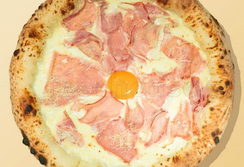 корж для пиццы, сливочный соус, сыр моцарелла, бекон, ветчина, чесночный соус, сыр пармезан, желток