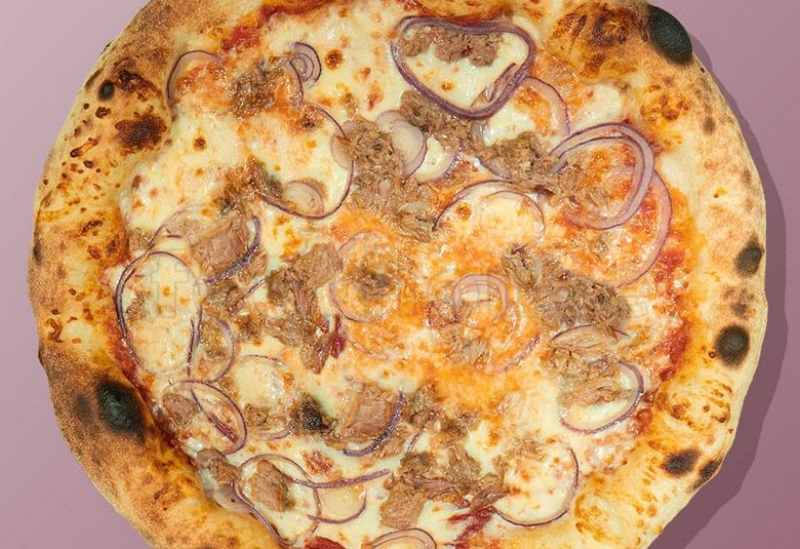 корж для пиццы, красный соус, сыр моцарелла, карамелизированный лук, консервированный тунец
