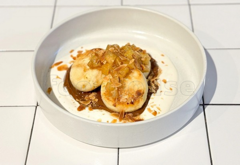 Сладкие сырники, сметана, вареные сливки, карамелизованные яблоки с корицей, миндальные хлопья