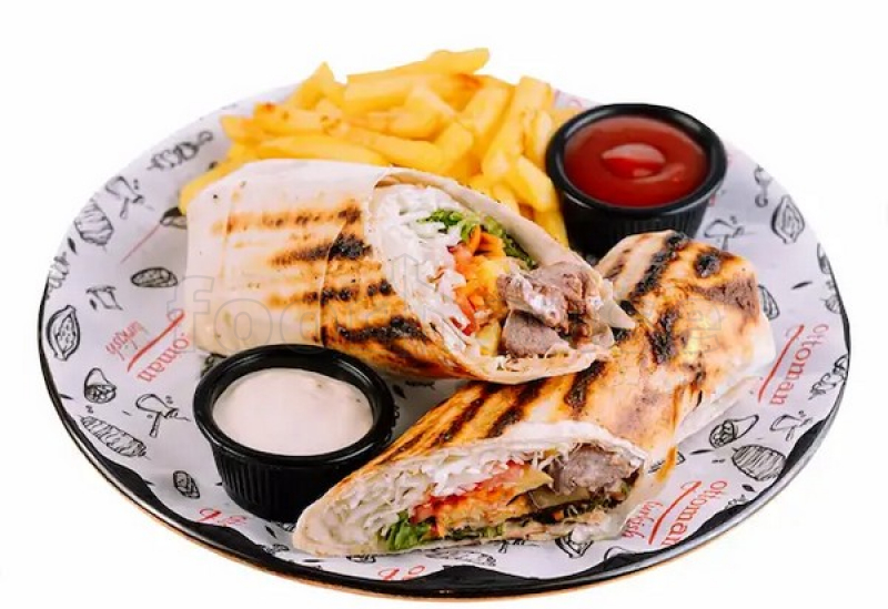 Кебаб с говядиной, картофель фри, красный соус, белый соус