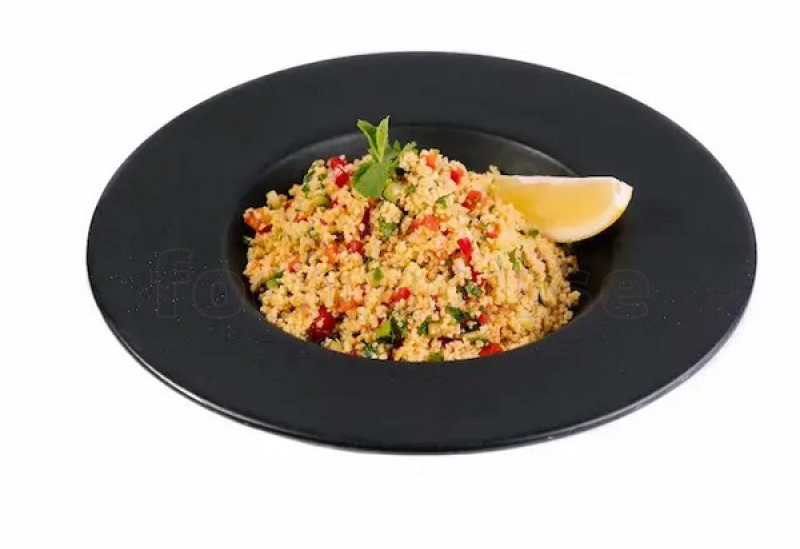 кускус, сладкий перец, красные огурцы, лук, лимонный сок, петрушка, мята, соус