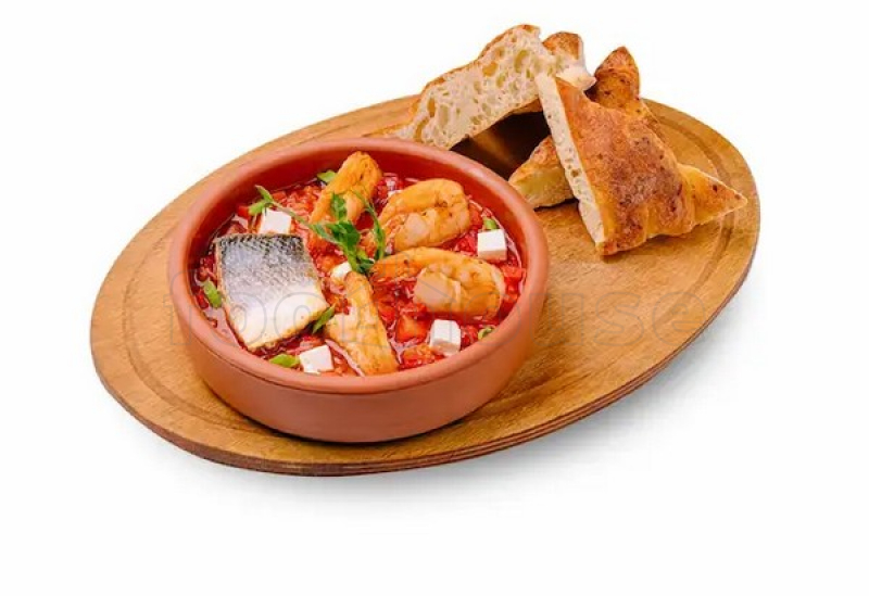 Креветки, рыбное филе, лук, перец, помидоры, огурцы, чеснок, сыр фета